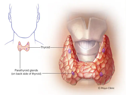 Parathyroid gland surgery. Some calcium phosphate stones are caused by overactive parathyroid glands, which are located on the four corners of your thyroid gland, just below your Adam's apple. When these glands produce too much parathyroid hormone (hyperparathyroidism), your calcium levels can become too high and kidney stones may form as a result. Hyperparathyroidism sometimes occurs when a small, benign tumor forms in one of your parathyroid glands or you develop another condition that leads these glands to produce more parathyroid hormone. Removing the growth from the gland stops the formation of kidney stones. Or your doctor may recommend treatment of the condition that's causing your parathyroid gland to overproduce the hormone.